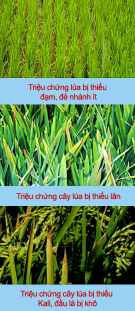 Đạm giúp cây sinh trưởng phát triển tốt, thiếu đạm cây phát triển thân lá kém, lá chuyển màu xanh vàng, cây thấp, bông ngắn, lép nhiều. nếu bón quá nhiều đạm, bón không cân đối với lân và kali hoặc bón không đúng kỹ thuật dễ dẫn đến lốp đổ, hạt lép nhiều, sâu bệnh phá hại nặng. * Dinh dưỡng lân (Ký hiệu là P). Ngoài hàm lượng lân, phân lân còn có vôi và một số khoáng chất khác. Lân kích thích cây ra rễ mạnh, hình thành nhiều nốt sần, hạt chắc. Một số loại phân lân còn có tác dụng cải tạo đất chua như phân lân nung chảy Văn Điển... * Dinh dưỡng Ka li (ký hiệu là K). Kali có tác dụng làm cứng cây, quang hợp tốt, bông to, chắc hạt, chống rét, hạn chế sâu bệnh. Kali dễ hoà tan, phân huỷ nhanh. Không nên bón kali khi lá lúa còn ướt sẽ làm khô táp lá. * Dinh dưỡng hỗn hợp NPK Có đầy đủ các thành phần Đạm, Lân, Kali. Để tránh bị phân lân và phân NPK chất lượng kém, chỉ mua phân bón của cơ sở sản xuất phân có uy tín như: phân lân và phân NPK Văn Điển; phân lân và phân NPK Lâm Thao.