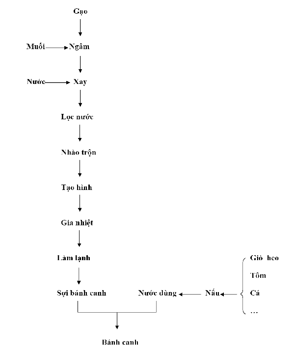 3. Giải thích quy trình Nguyên liệu: cơ sở sinh hóa của việc sản xuất bánh canh là nhờ vào khả năng tạo sợi của các hạt tinh bột sau khi được giải phóng và hồ hóa. Thành phần chính của tinh bột gạo là amylose và amylopectin. Chính 2 thành phần này sẽ tạo thành gel tinh bột ở một nồng độ nhất định khi được gia nhiệt và làm nguội. Gel tinh bột từ amylose thường cứng và đàn hồi kém còn amylopectin tuy khó tạo gel ở nồng độ thấp nhưng gel amylopectin trong, dính và có độ nhớt cao. Do đó, nếu bánh canh được làm hoàn toàn từ bột gạo thì sợi bánh sẽ đục, bở, nhưng nếu bánh được làm từ bột năng (chứa chủ yếu là amylopectin) thì sợi bánh sẽ dai, dẻo và trong, ta cũng có thể pha thêm bột năng vào bột gạo theo tỷ lệ 50g bột năng/1kg bột gạo.